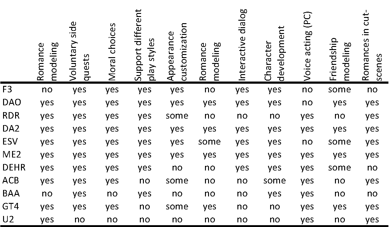 How each feature is present in the games is summarized in Figure 1. As there is only one game (the Uncharted 2 [17]) having no optional side quests, this category cannot be used in analysis. The results are not likely reliable when there is only one game in one group and ten in another. Cut-scenes and scripted events category is not used because all these games use them. In addition, dialogue with personality options was dropped, as all the selected games that have interactive dialogue also have also personality options. Another categorization issue is whether the Fallout 3 has romances in cut-scenes. If one haw the perk “Black Widow”, it is possible to flirt with a nonplayer-characters, and after that how the character is in love with the player-character is told as a scripted events: the player-character receives love letters later). This is marginal; hence, Fallout 3 does not contain this feature.