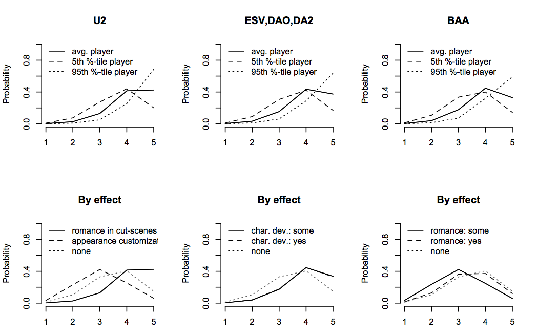 Figure 5 illustrates the model for story consistency using predicted probabilities for each effect separately. The figure show higher story constancy score predictions of the features character development (some and yes) and romances in cut-scenes. Lower scores are associated to the features of appearance customization and romance modeling (some and yes). The model also illustrate the net effects using the U2, DAO, ESV, DA3, and BAA as an example.