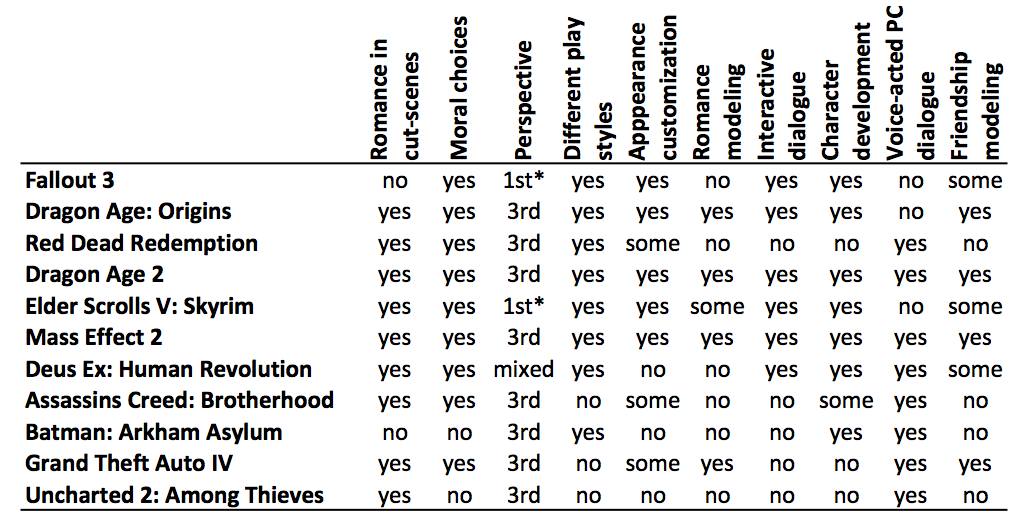 The following formal features where selected (c.f., [1]): dialogue vs interactive dialogue, moral choices (no–yes), supporting different play styles (no–yes), cut-scenes with romantically content – romance in cut-scenes, appearance customization (no; possibility to change some aspects of the character, e.g., cloths, hair style); customizing sex and appearance, character development (no, scripted character development, player-guided character development), player character dialogue is voice acted (no–yes), romance/friendship modeling (some modeling, complex modeling as in Dragon Age: Origins) and moral choices (no–yes).