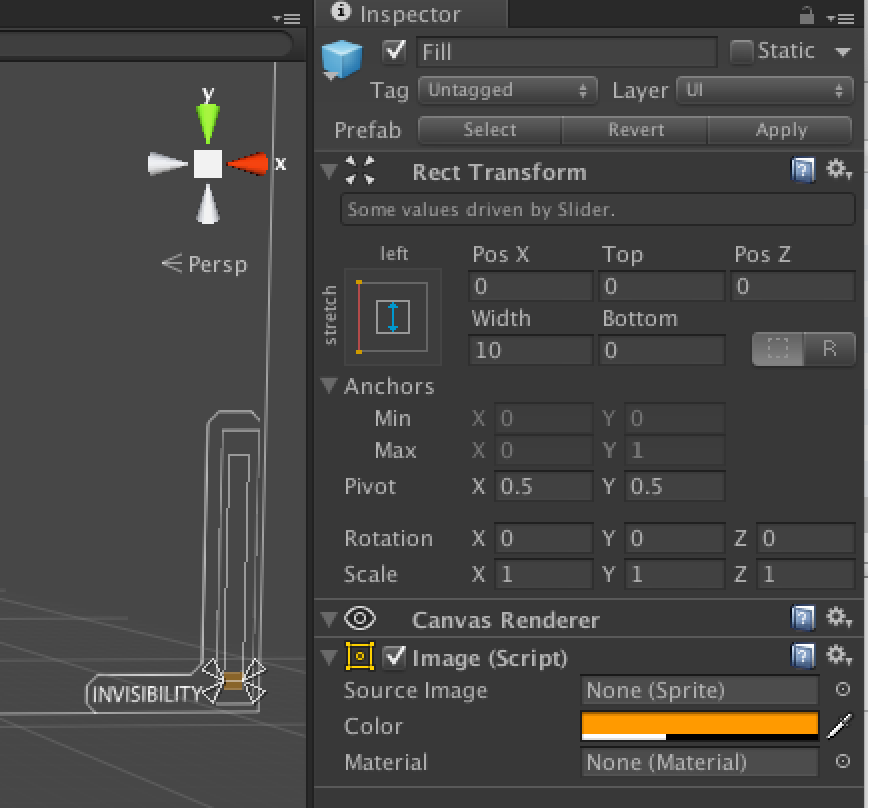 Lets start with setting up HUD. We need Canvas (GameObject -> UI -> Canvas), couple Images (GameObject -> UI – Image) and Sliders (GameObject -> UI -> Slider). I add canvas under GameManager. I first created background for Invisibility bar and Slider for displaying the energy left. You can drag then object where you want them to be, After that was ready, I copied objects (and modified the parts to make it fit to another corner and have correct texts.)