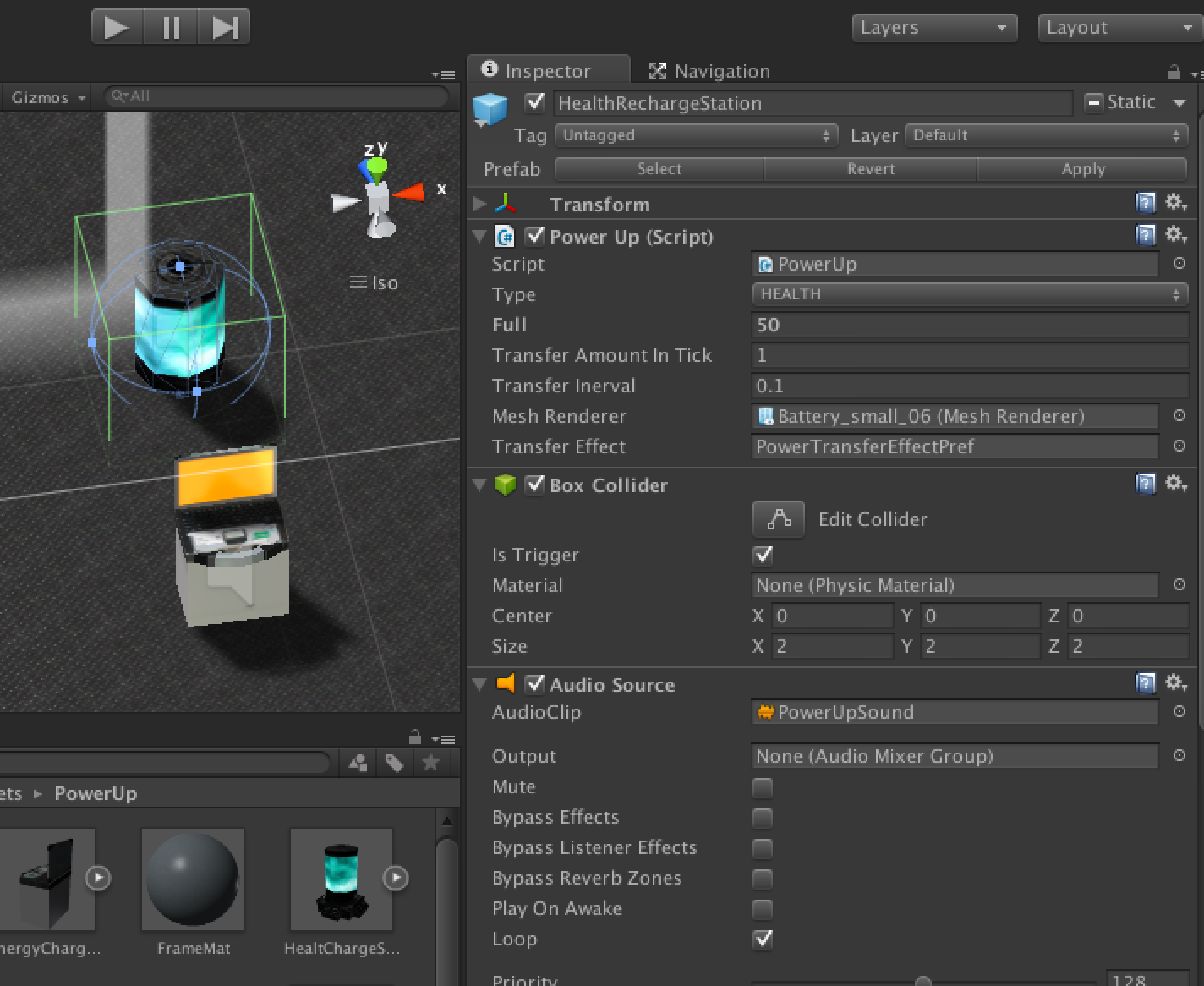I need to game objects: one for power and another for health recharging stations. The models in image are from asset store (Scifi Battery by 256px and Toughbook published by Unity; with cube added.)