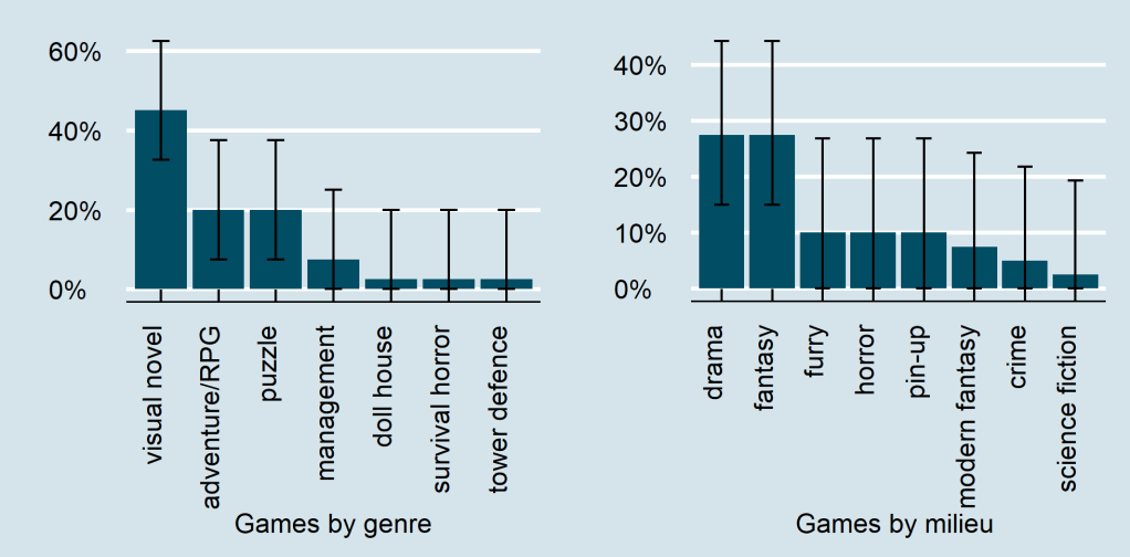 37.5% (CI95=25%‒54%) of games in the sample include dating sim mechanics but as a secondary genre. For example, Depraved Awakening is a visual novel and Renryuu: Ascension (Naughty-Netherpunch 2021) is an adventure game/RPG but both include some dating sims mechanics.