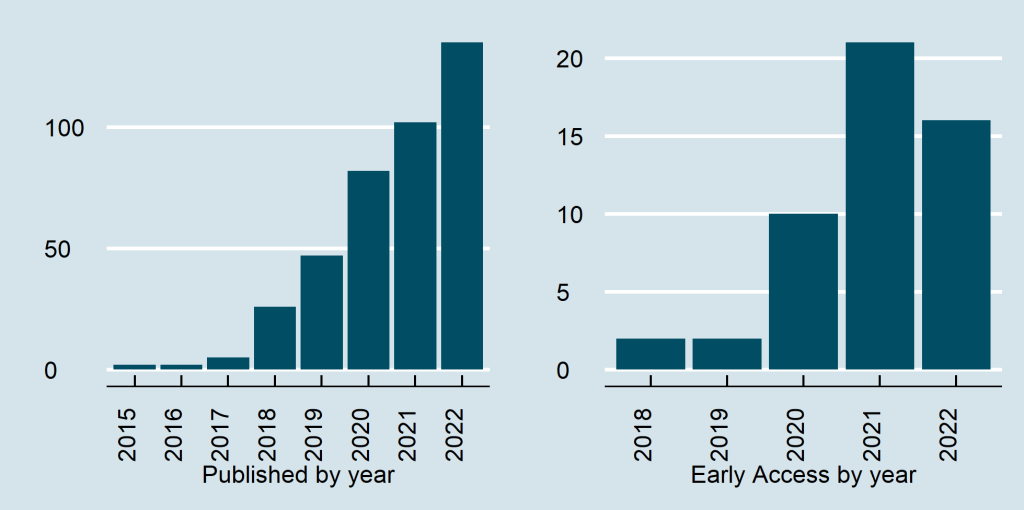 Figure 1. Adult games and DLCs published by year and Early Access apps by year (from all 430 games). 2022 figures only contain games from January to September 4.